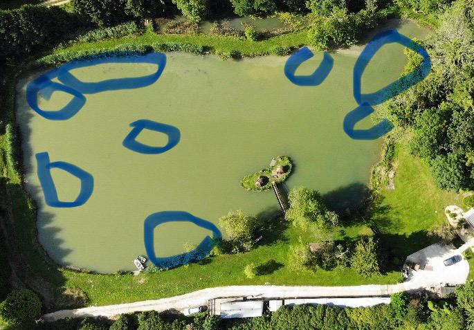 Everyone asks where the best place to fish is! There appears to be no best place – if it’s very hot and sunny the best results have come from the top of the lake which is more shaded. Night fishing has generally proved to be good off the bank adjacent to the caravan. Our lake bottom is mainly clay, there are gravel / hard areas which are highlighted in the image below.